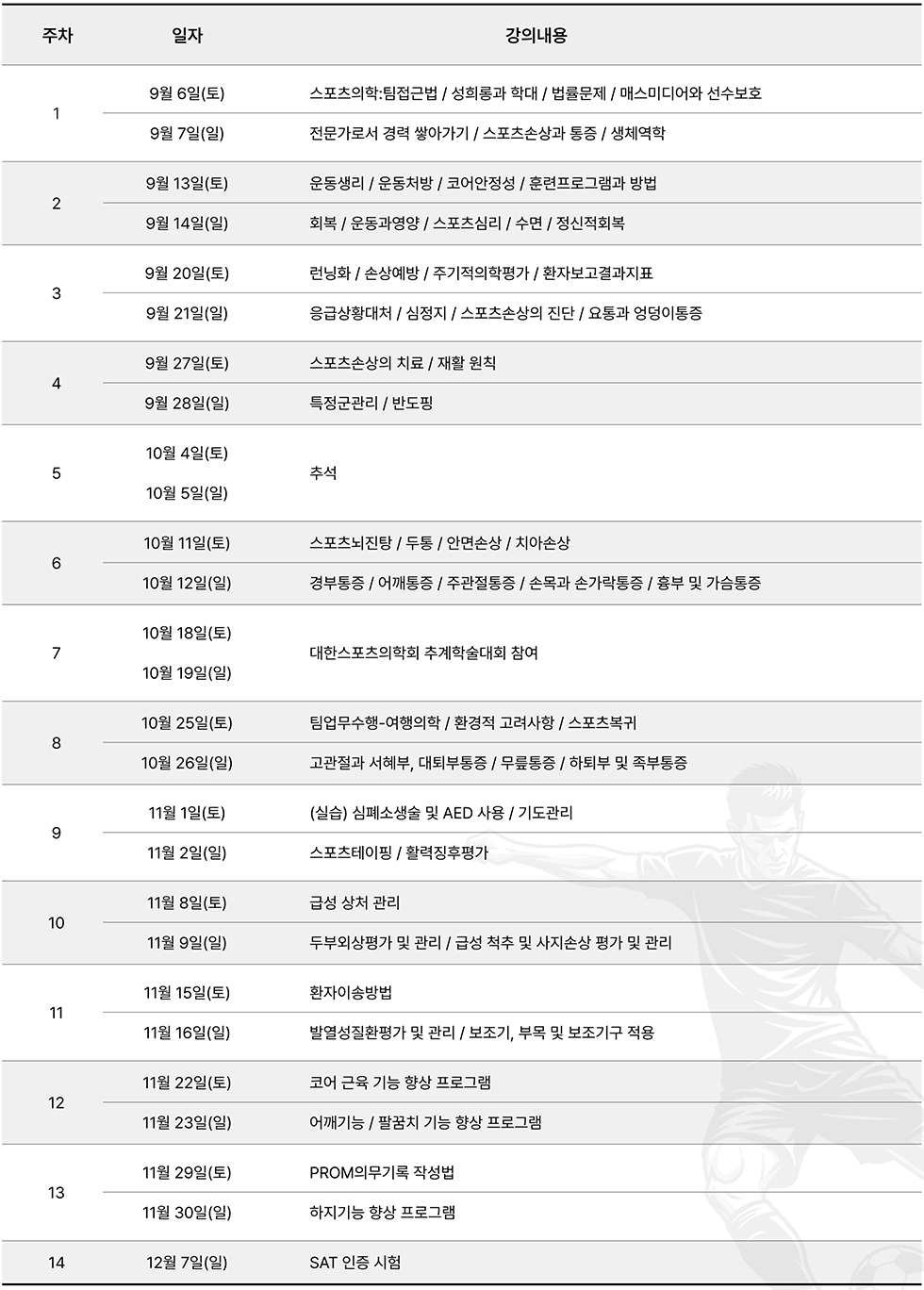 사단법인 대한스포츠의학회 주관 2025년 스포츠 트레이너 인증 프로그램은 스포츠의학 분야의 필수적인 기본소양과 전문성, 실무능력을 겸비한 인재를 양성하기 위해 마련되었습니다. 이번 교육프로그램을 통해 스포츠의학의 최신 지식의 습득은 물론, 현장에서 즉시 활용 가능한 필수적인 실기 중심의 과정과 다양한 분야의 전문가들과의 교류를 통해 여러분의 역량을 한층 더 끌어올릴 수 있을 것이라 기대합니다.